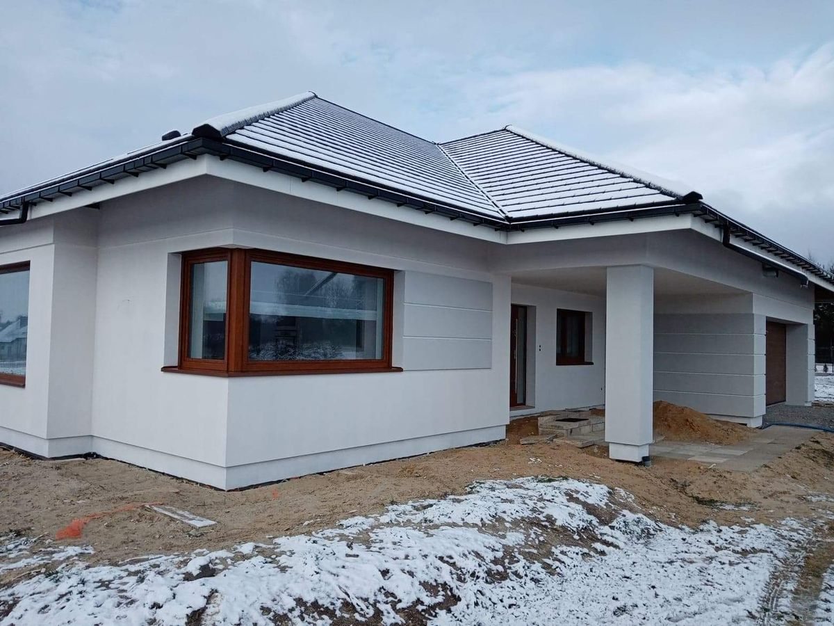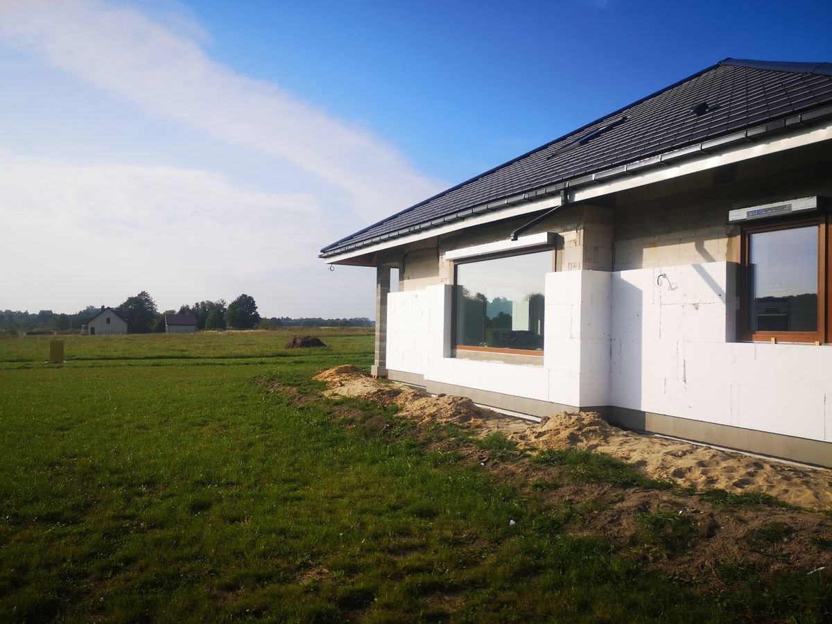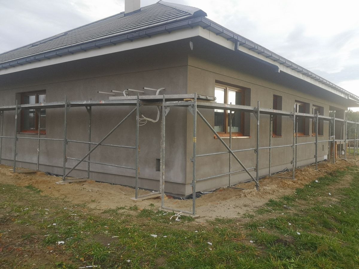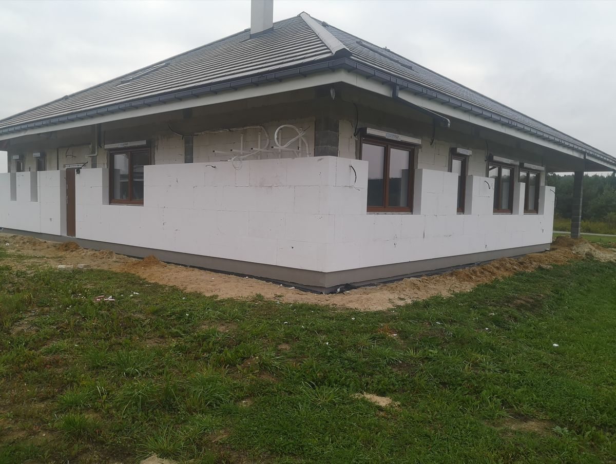 Na tym etapie realizacji zlecenia wykonane zostało ocieplenie ścian zewnętrznych. Następnie zostały one pokryte klejem i dokładnie zagruntowane. Prace te miały na celu zabezpieczenie domu przed niekorzystnym działaniem czynników atmosferycznych. Dodatkowo został wykonany także montaż parapetów zewnętrznych. W przyszłości inwestor zaplanował także wykonanie podbitki dachowej oraz pokrycie elewacji odpowiednim wykończeniem. Poniżej znajduje się kilka zdjęć z realizacji projektu.