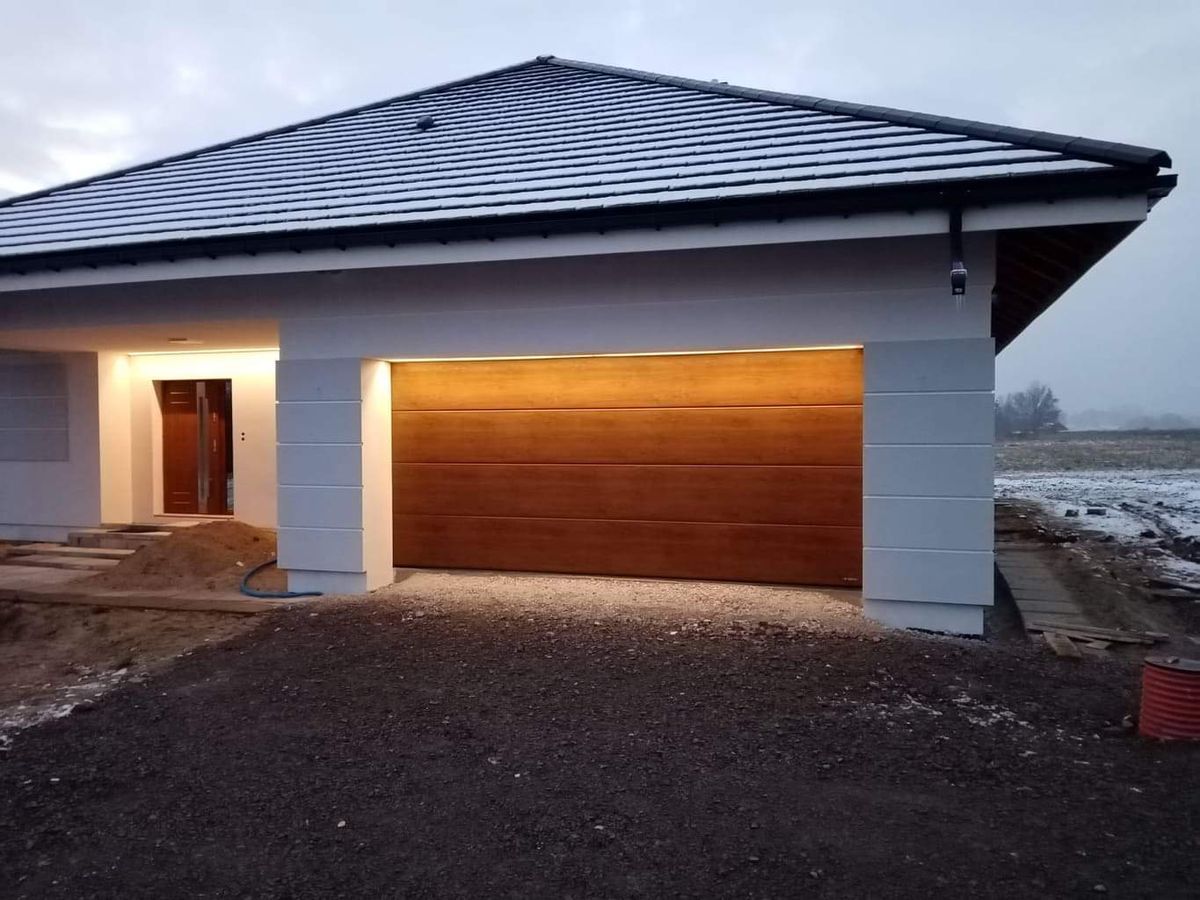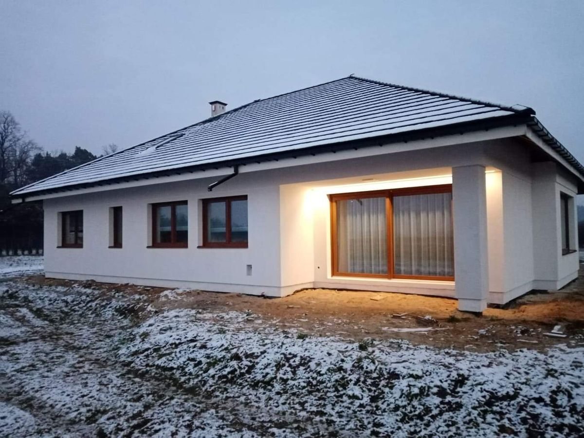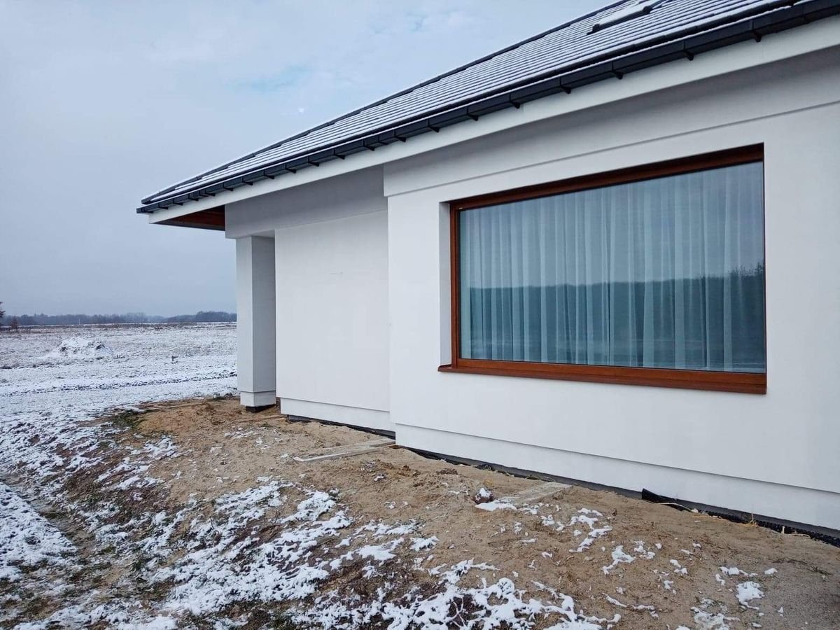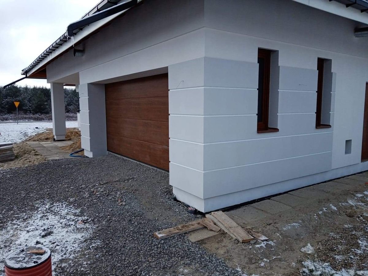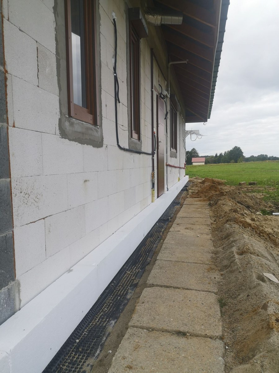Na tym etapie realizacji zlecenia wykonane zostało ocieplenie ścian zewnętrznych. Następnie zostały one pokryte klejem i dokładnie zagruntowane. Prace te miały na celu zabezpieczenie domu przed niekorzystnym działaniem czynników atmosferycznych. Dodatkowo został wykonany także montaż parapetów zewnętrznych. W przyszłości inwestor zaplanował także wykonanie podbitki dachowej oraz pokrycie elewacji odpowiednim wykończeniem. Poniżej znajduje się kilka zdjęć z realizacji projektu.